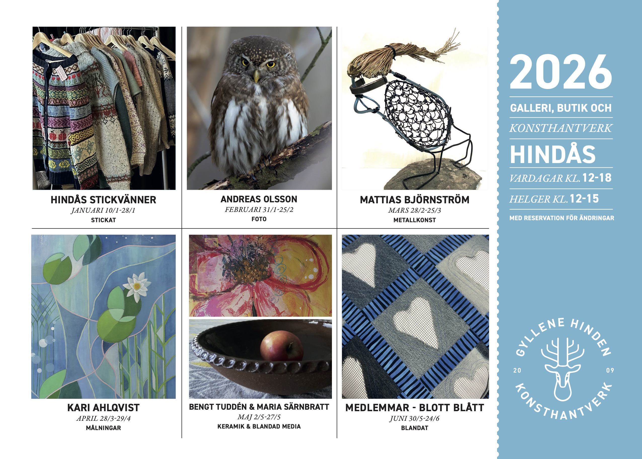 I den charmiga butiken hittar du lokalproducerat konsthantverk, konst och slöjd av hög kvalitet. Här blandas bruksföremål och unika alster tillverkade av olika material som textil, keramik, glas, metall, betong och trä. I galleriet visas varje månad en ny intressant utställning med gäster även från närliggande kommuner. Gyllene Hinden är en mötesplats för skapande av nya kontakter samt utbyte av erfarenheter, tankar och idéer!